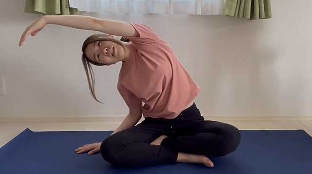 2⃣脇腹を気持ち良い程度に伸ばしていきましょう。息を止めないように10秒程伸ばします。