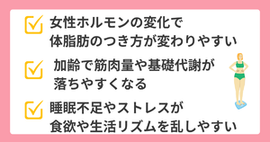 更年期の体型変化にはこうした背景があるため、若い頃と同じ感覚でとらえないことが大切です。