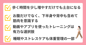 急に減らすより、これ以上増えにくくする視点で生活を整えていきましょう。